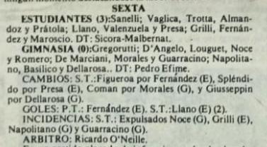 Estudiantes: Juan Sanelli; Vaglica, Trotta, Prátola, Valenzuela; Almandoz, Grilli, Alejandro Presa; Fernando Llano, Jorge Fernández, Maroscio. DT Cicora – Malbernat.