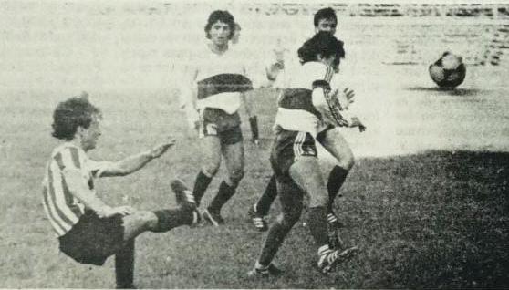 N. de la R. (foto de tapa en blanco y negro): cabezazo goleador de Roberto Trotta ante Gremio, el primer gol de la noche del jueves 8 de noviembre de 1990. El triunfo fue 2 a 0 y dio la clasificación a Semifinales. Esa noche fueron expulsados Yorno, Centurión y Trotta y cuatro jugadores brasileños.