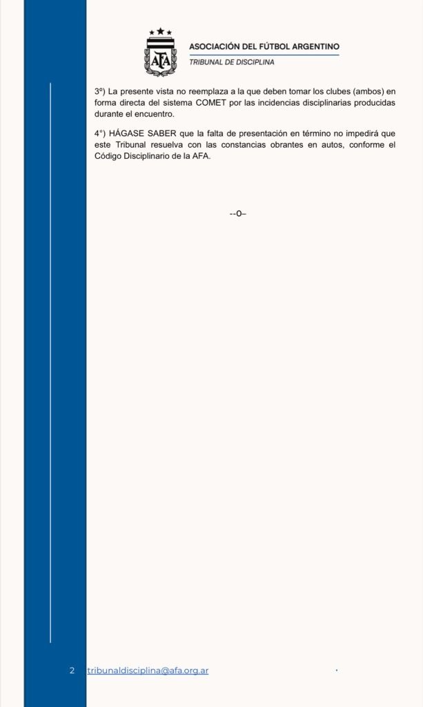 El Tribunal de Disciplina actuó de oficio y detalló que abrió el expediente por el comportamiento del plantel antes del inicio del encuentro del 23 de noviembre. Señaló que la investigación se vincula con un eventual incumplimiento del boletín publicado el 12 de febrero, que establecía el procedimiento del homenaje. También remarcó que se garantizará el derecho de defensa.