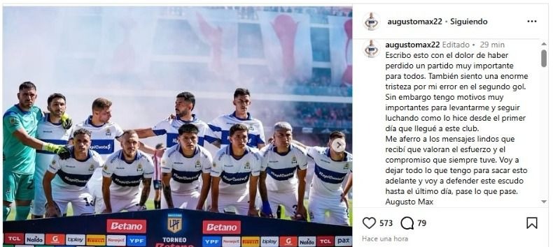 Después de la derrota de Gimnasia ante Estudiantes por 2-0 en el Estadio UNO, Augusto Max rompió el silencio y utilizó sus redes sociales para pedir disculpas por el error que derivó en el segundo gol del Pincha, apenas comenzado el complemento del clásico platense.