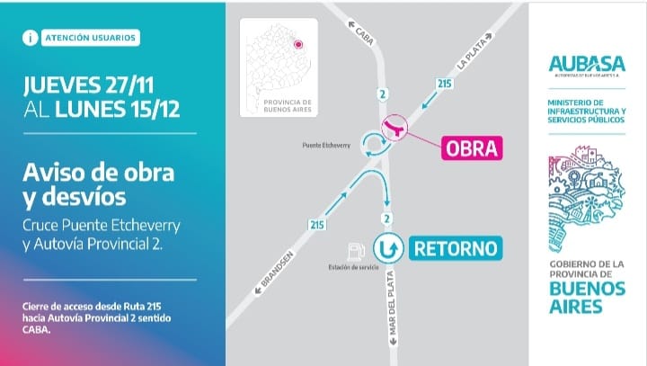 Durante el período de obras, los conductores que circulen por la Ruta 215 y busquen incorporarse a la Autovía 2 deberán modificar su recorrido: la alternativa sugerida es tomar la Autovía en sentido hacia la Costa Atlántica hasta el retorno del kilómetro 60, frente a la estación de servicio, para retomar luego hacia Capital.