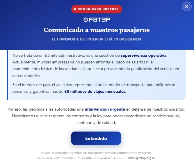 La Federación Argentina de Transporte de Pasajeros emitió un comunicado oficial en donde declaran que »la posibilidad de seguir circulando está en riesgo real por factores que exceden a las empresas». El comunicado denuncia: