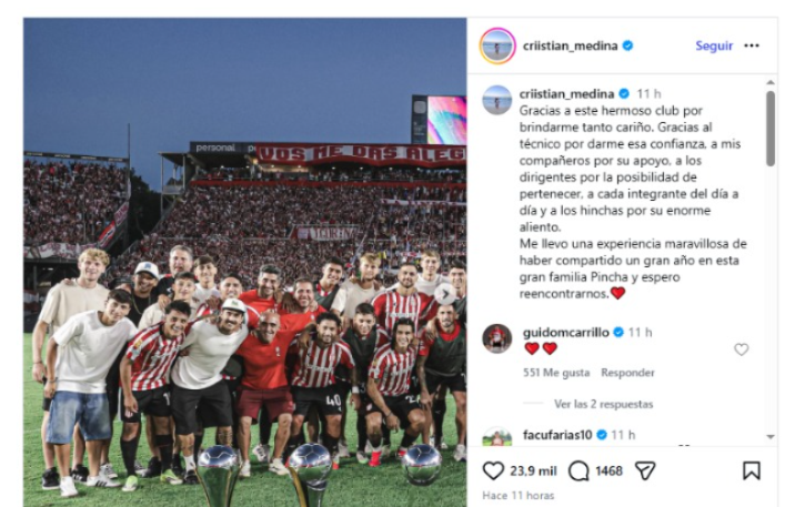 El posteo no pasó desapercibido. Medina agradeció al cuerpo técnico encabezado por Domínguez “por darme esa confianza”, a sus compañeros, a los dirigentes “por la posibilidad de pertenecer” y a cada integrante del staff con el que compartió el día a día.