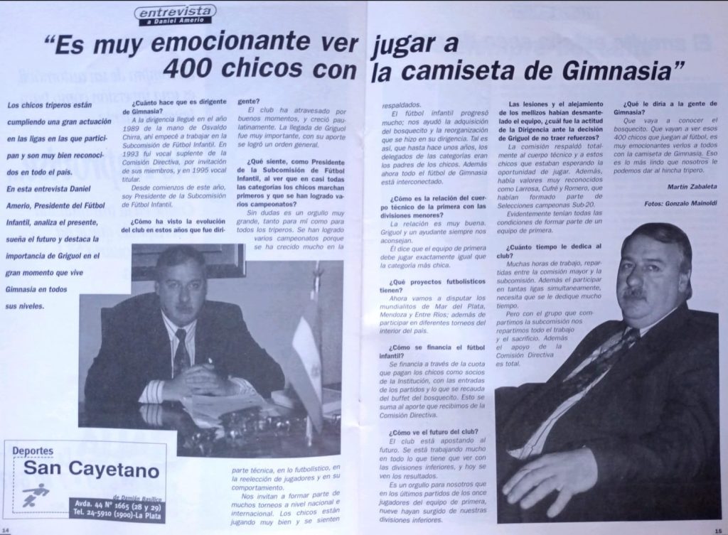 «La obra fue movida por la fe de triperos visionarios. Son once hectáreas, 10 canchas marcadas, 700 pibes, torres de iluminación, un quincho para hacer una parada y ver por los ventanales un partido», describe Néstor Basile, director de la revista Tribuna Gimnasista ya en 1997, año en que el Estadio Juan Zerillo celebró su primer grada popular con tablones de hormigón. En ese artículo se subrayan otros responsables de la movida: Edgardo Colavita, Daniel Roberts, Sergio Saráchaga, «y anótele una a favor al Gordo Vicente«, apuntó la pluma del «Ronco», por el recordado Roberto Vicente, presidente mens sana entre noviembre de 1989 y el mismo mes de 1991, que había dicho presente en una difícil: octubre de 1983, duros tiempos del equipo en la vieja Primera B de AFA.