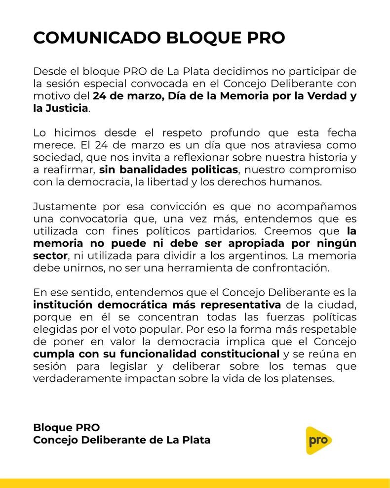 Desde el PRO La Plata justificaron su decisión cuestionando el enfoque del acto. Según manifestaron, consideran que este tipo de sesiones en lugares externos al Concejo terminan siendo «utilizadas políticamente» y que no contribuyen a una mirada integral de la historia. Por su parte, desde el sector de LLA mantuvieron una postura similar, marcando una distancia ideológica con la narrativa del evento.