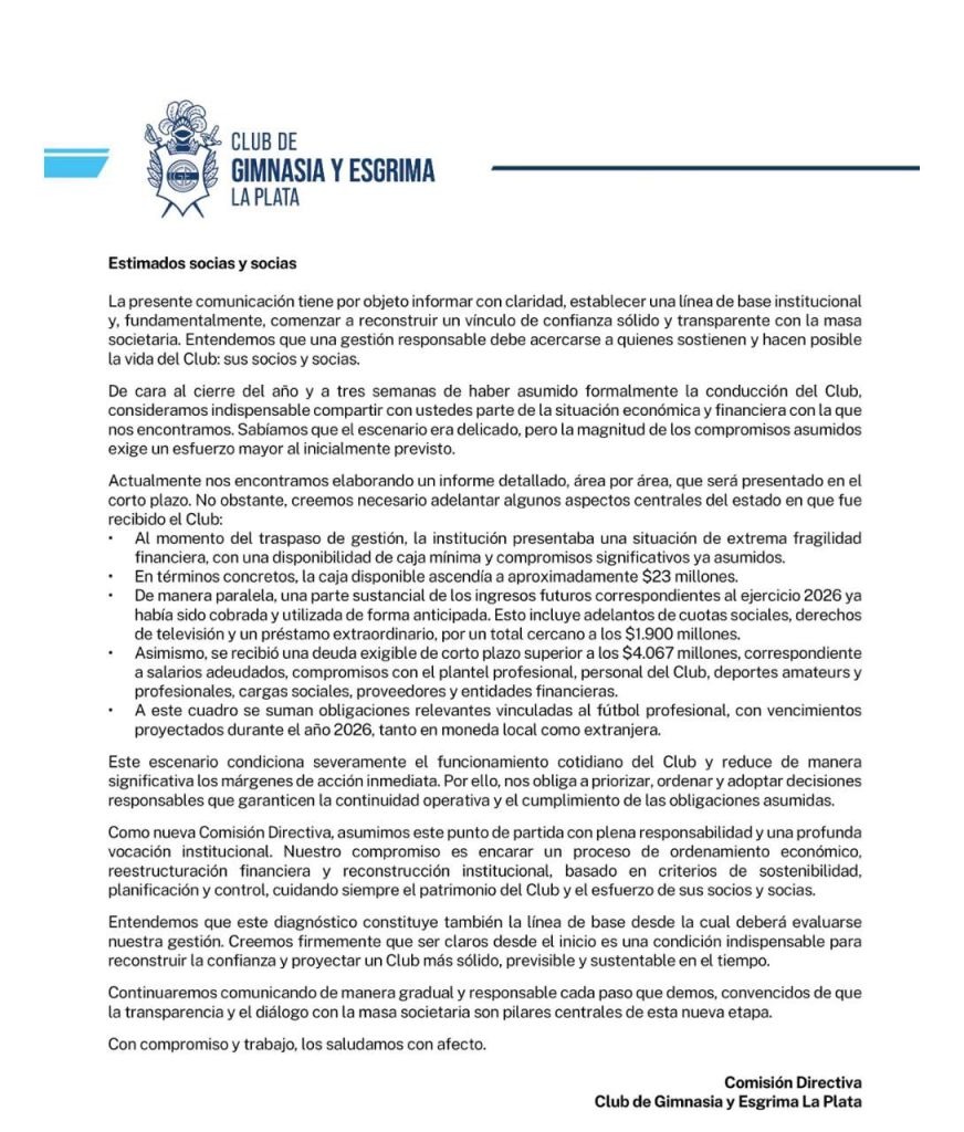 El comunicado marca un punto de partida para una etapa que promete ser compleja en el plano económico y financiero, mientras el mundo Gimnasia espera definiciones y un panorama más claro en los próximos informes oficiales.