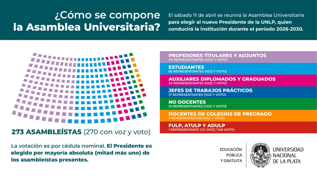 La Asamblea Universitaria de la Universidad Nacional de La Plata se reunirá el sábado 11 de abril para elegir al nuevo presidente de la casa de estudios. La sesión comenzará a las 8 en el Salón Auditorio de la Facultad de Psicología, ubicado en calle 51 entre 123 y 124, en Ensenada.