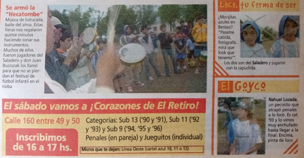 Pasó el tiempo, el Gordo Juan no está pero me sonríe mientras creo que me lee. Lo siento al lado. Tampoco está el Bocha Eustaquio Berón, casero de la cancha y vecino de la mano de enfrente al campo de juego, que aquella plomiza tarde de enero aplaudía. Había puesto los globos para decorar la fiesta que hicimos con el diario. Elegimos Saladero, que era parte de mi infancia modelo ’74. Elegí creer en esa familia futbolera que en la semana organizaban una copa de leche para el verdadero motivo de existencia que deben perseguir. Saladero, el que empezó en centro cívico y luego fue local en una parroquia, tiene su tierra actual sobre el barrio La Unión (por la zona del Corralón y del Cementerio) desde que un Municipio les otorgó las tierras. De ahí salió Nahuel, hoy tapa de varios diarios, campeón de la edición 24ª de la Copa Sudamericana.