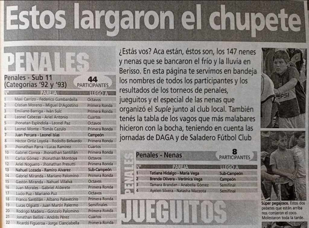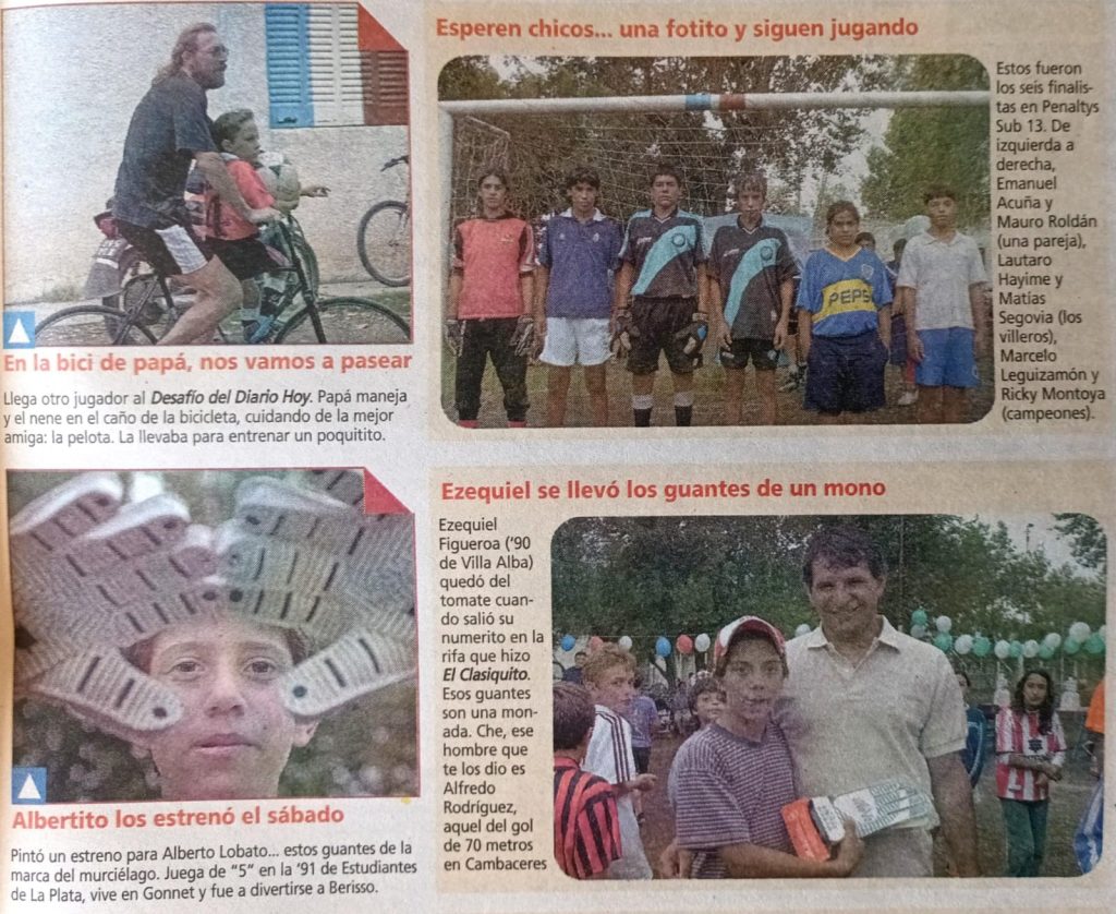 Nahuel, aquel flacucho de la categoría ’93, que se anotó en el torneo de penales veintiún años atrás, cuando tenía diez, me llevó al archivo, a abrir ese álbum o túnel del tiempo donde guardo mi mayor tesoro: “Este dúo de Saladero, a solo un paso de la gloria”, titulaba. El comentario da cuenta que jugó con Ramiro Alvarez, “terribles penaleros de Saladero Fútbol Club, hicieron fama este verano llegando a la finalísima”. Una particularidad: habían quedado iguales con otra pareja y una nena de nombre Camila (que había llegado con ellos y con el papá de Nahuel) “sacó un papelito y los mandó a la final”. Ahí perdieron con Juan Percara y Leonel Isla, que se volvieron a La Plata con los premios. Se habían anotado 44 parejas. Anécdota de color: invitamos al arquero Alfredo Rodríguez (representante de la empresa Enevé en la regón) y por su gentileza sorteamos guantes. Ese «Mono» Rodríguez que se retiraba en Estrella ese año como campeón de la Liga Amateur y emprendía el rol de entrenador de arqueros. Anoche vio la consagración de Losada atajando tres penales al Mineiro de Brasil, en su caso, viendo la TV en Santiago del Estero donde trabaja para Central Córdoba. Otro berissense que en 2024 ganó la Copa Argentina.