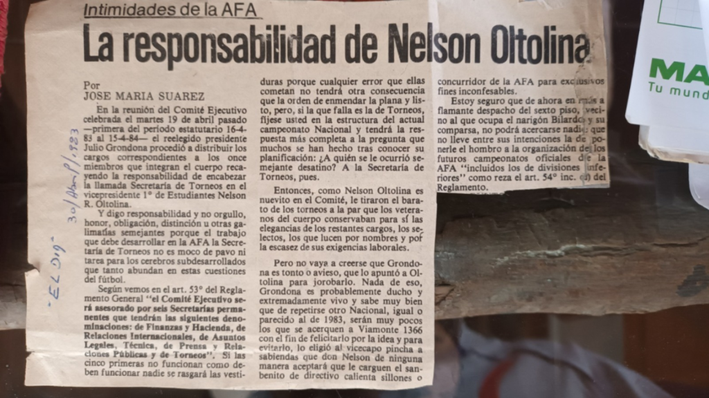 Oltolina nos recibe en su casa. Cordialidad, sentido común, lógica, amistad. Adjetivos que saltan a la vista de quien, además, fue miembro del Comité Ejecutivo de AFA (comisión de Torneos y luego de Selección), poniendo punto final en 1990 tras el subcampeonato en el Mundial de Italia. “Hasta acá llegué, Julio (a Grondona). Cuando terminó ese mundial también empezó a a finalizar mi etapa presidencial en Estudiantes”, explica.