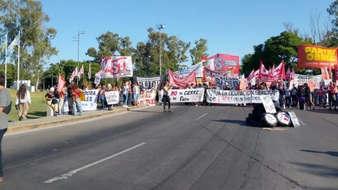 Un grupo de manifestantes realizó este viernes un corte en el acceso a la Autopista La Plata-Buenos Aires en rechazo a la reforma laboral que se debate en el Congreso y en respaldo a la denominada “ocupación obrera en FATE”.