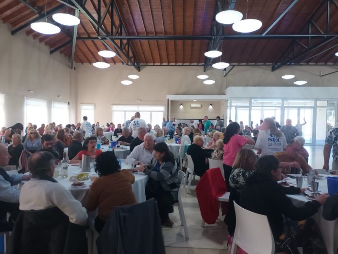 Hay un lema que se cumple: “tender la mano amiga al compañero”, como dice con aires campechanos Carlos Alberto Restivo, el secretario general, gravitante en el andamiaje de un Sindicato que crece a pasos lentos y confiables. Afable, Carlitos también fue mozo en la celebración del Jubilado, a la que llegó después de pasar la mañana en otra punta del camping donde la familia celebró el cumple de una nieta. Ex jugador de Gimnasia y Esgrima La Plata en las divisiones formativas allá por los años 60, cuando vio nacer el apodo de “El Lobo”, colores que lo vieron llorar de las distintas formas en que ese llanto cae por las mejillas de un hincha que llegó del interior… ¡de Azul! “Pásenla lindo que para eso trabajaron toda la vida y se merecen lo mejor”, anunciaba a viva voz Adrián Toledo, animador, aquel de Los cantores de la Paz, cuando a las 13.25 del renovado día de la Primavera (del jubilado, del estudiante y otros títulos) aparecieron con las bandejas plateadas el grupo directivo para presentarse como los mozos. Un mozo por cada mesa. Un directivo para cada afiliado. “Bailemos y comamos, ¿cuántas primaveras nos quedan?”, rompe la quietud en esa mesa donde ya están las ensaladas y se esperan los pollos, que precisamente provenían de una empresa afiliada al Sindicato como “Pim Pollo”.