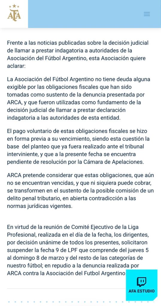 El conflicto se originó a partir de denuncias presentadas por ARCA (Agencia de Recaudación y Control Aduanero), que apuntan a presuntas irregularidades administrativas y financieras vinculadas al funcionamiento de la AFA. Estas acusaciones generaron preocupación en el ámbito dirigencial y motivaron el respaldo institucional de los clubes.