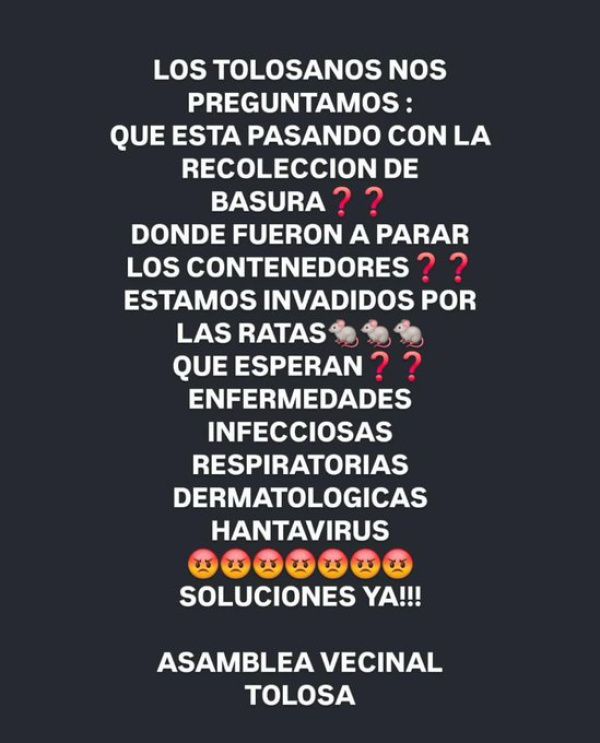 Crece la preocupación en Tolosa por la falta de recolección de residuos. Vecinos aseguran que la basura se acumula desde hace días, aparecen ratas y temen por problemas de salud. Reclaman respuestas urgentes y una solución definitiva ante una situación que describen como insostenible.